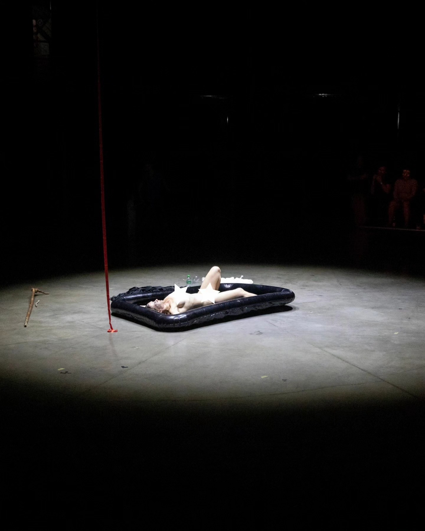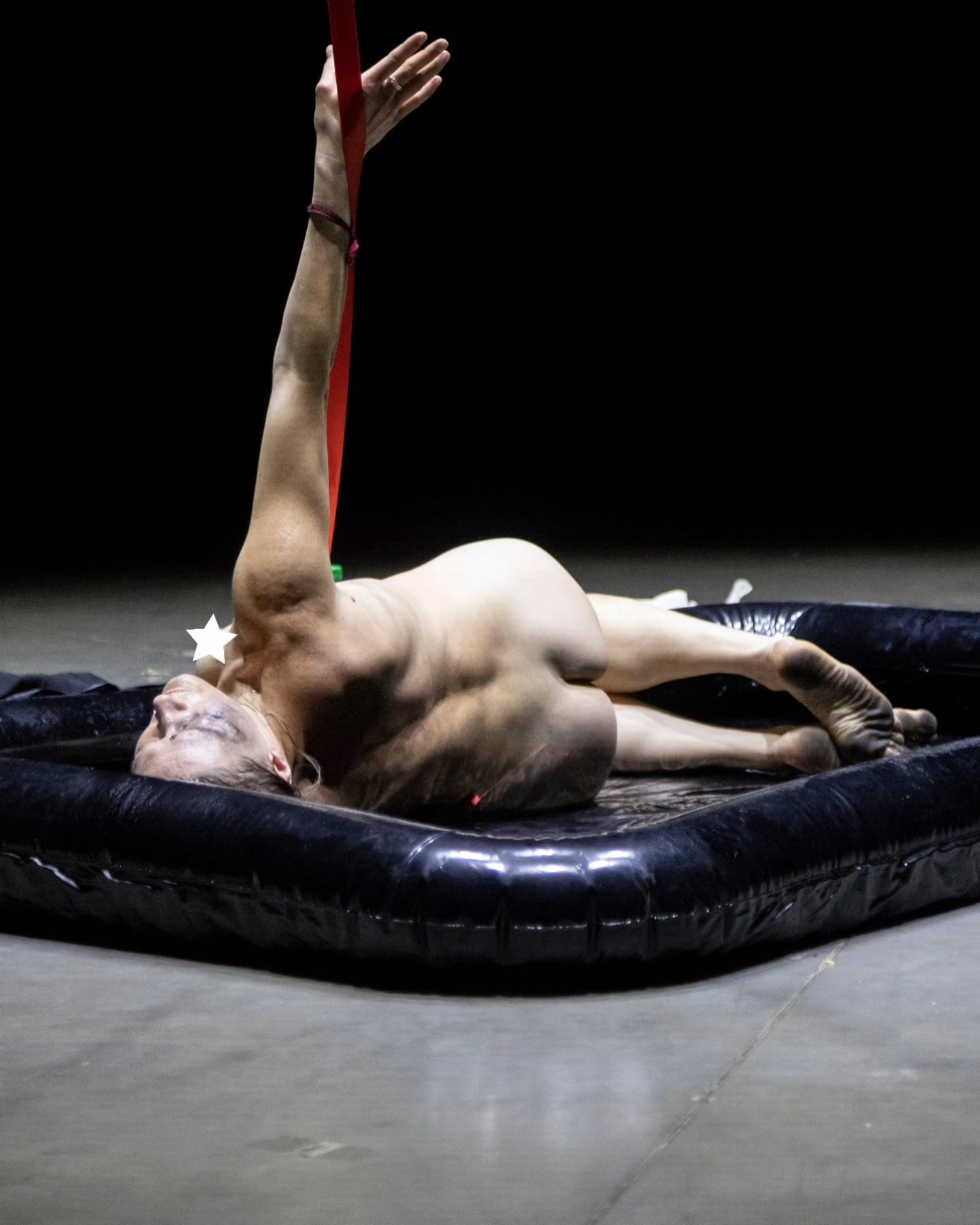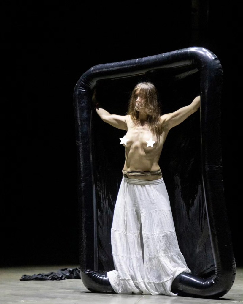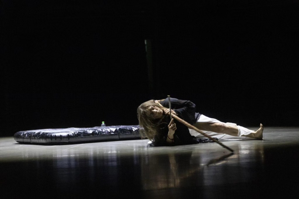 “Artist Meri Hietala (Finland) takes the audience to ancient times in her performance “Womb”. She is a sorceress, a witch who speaks quietly and calmly to the audience, gradually luring them deep, deep into the dark forest. The artists of other performances (this kind of mutually supportive, improvised cooperation between the performers is very pronounced this time in “Space”) play simple, meditative sound-creating instruments. Then naked Meri Hietala sits in an empty, black rubber pool, oils herself up and transforms into a strange, indefinable creature in which the feminine, the untamed and the primal merge. Her radiated energy is not explosive, but balanced and creative. All this time, Meri is in contact with the audience, addressing everyone and no one at the same time, and hypnotically attracting attention.”