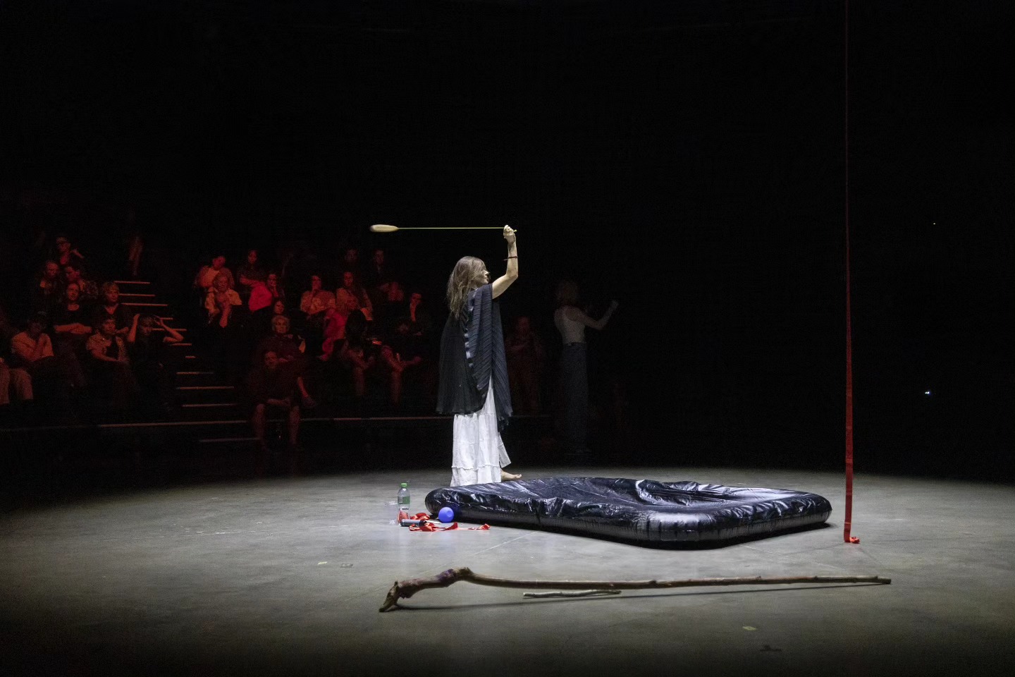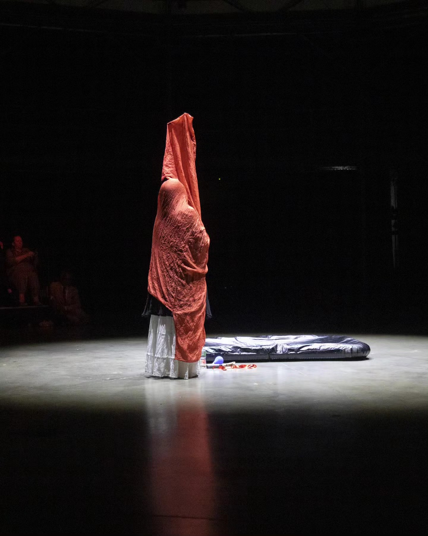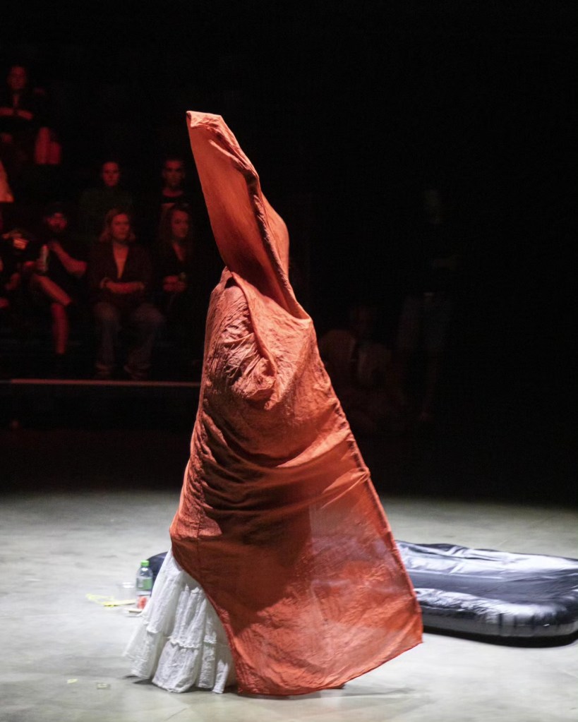 “Artist Meri Hietala (Finland) takes the audience to ancient times in her performance “Womb”. She is a sorceress, a witch who speaks quietly and calmly to the audience, gradually luring them deep, deep into the dark forest. The artists of other performances (this kind of mutually supportive, improvised cooperation between the performers is very pronounced this time in “Space”) play simple, meditative sound-creating instruments. Then naked Meri Hietala sits in an empty, black rubber pool, oils herself up and transforms into a strange, indefinable creature in which the feminine, the untamed and the primal merge. Her radiated energy is not explosive, but balanced and creative. All this time, Meri is in contact with the audience, addressing everyone and no one at the same time, and hypnotically attracting attention.”