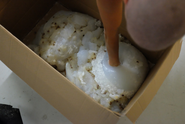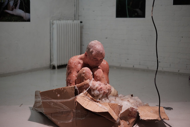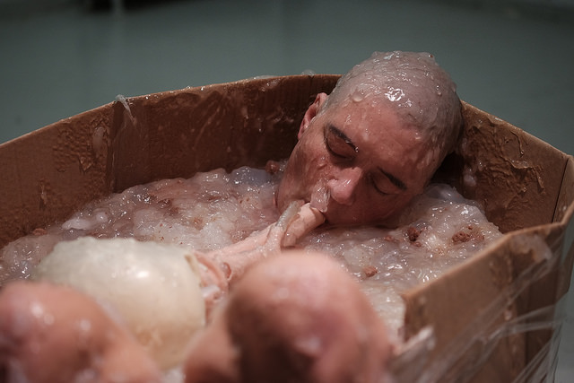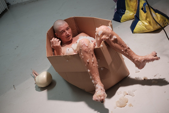 In the performance, I am inside the box which is filled with meat gello, lihahyytelö – alatoopi in Finnish, its made with cat food. Duration about an hour. Thanks for Arttu, Max, Katri, Vappu, Antti & Co for your helpful hands. Special thanks goes to the dog who licked my skull.