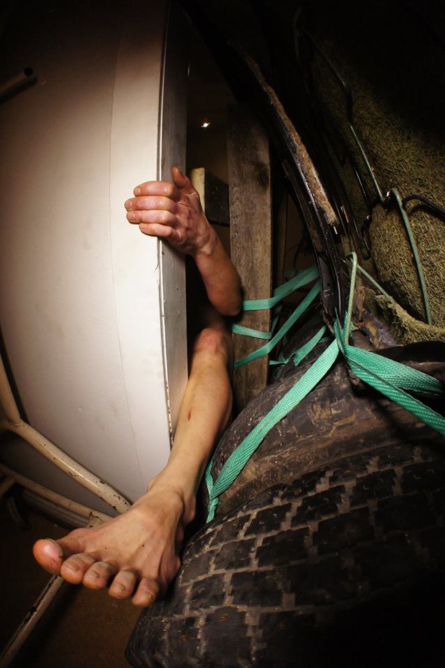 Hei. Me ollaan Antti ja Meri. Tää meidän työskentely on aika keholähtöistä, ja siihen liittyy paljon ahtautumista erilaisiin paikkoihin.