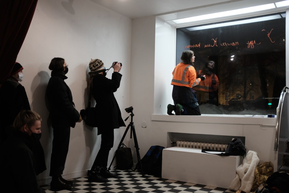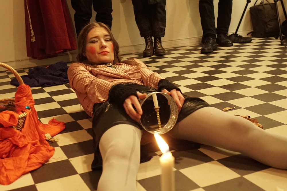 16.1.2021 solo performance, Oksasenkatu 11 Gallery, Helsinki, Finland. Curated by Aino Johansson – Performance art event during her exhibition Kaiken keskellä. Photos Antti Ahonen