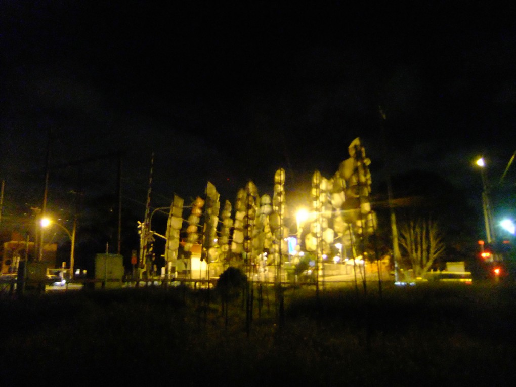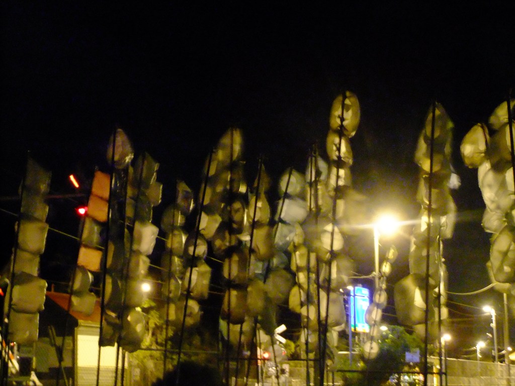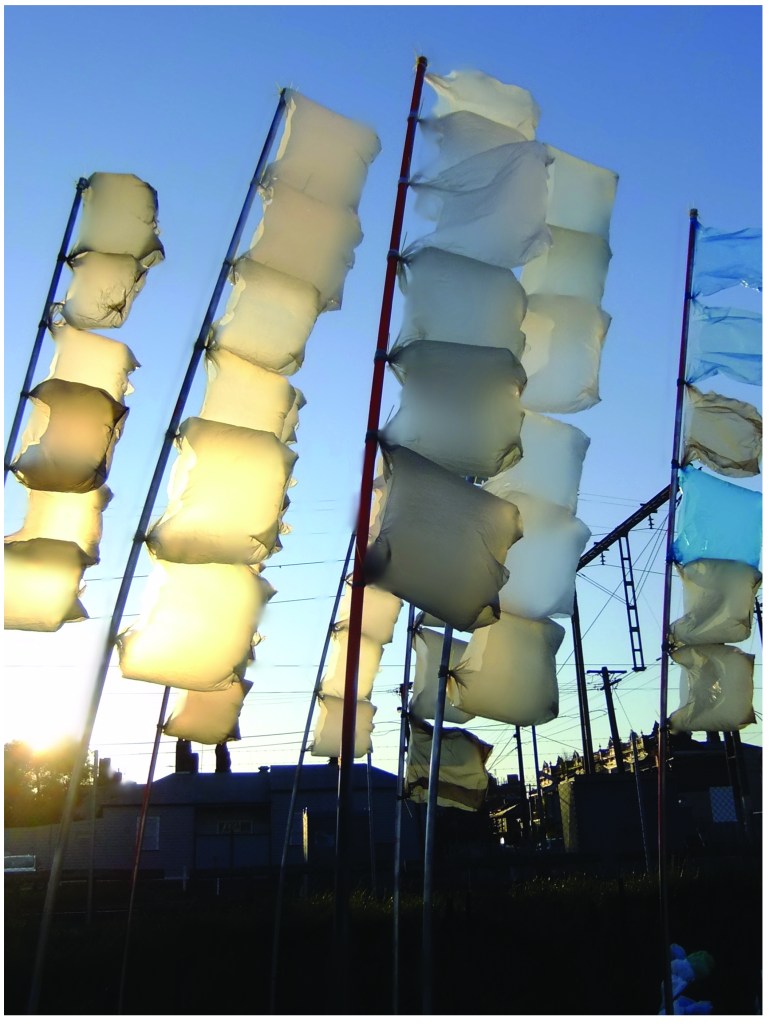 Art piece creates sounds in the wind and when the train passes by. Memorial to my grandmother. Wishes into the wind*Materials; recycled plastic bags, pvc pipes